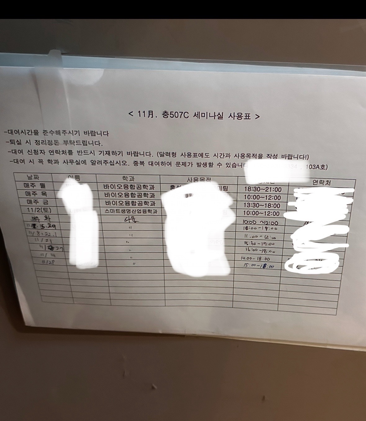 그리고 현재는 아래 양식을 사용하여 직접 학과사무실에서 이름, 날짜, 사용목적 등을 적고 사용하는 방식이었다. 그로인해 학생, 교수님들 불편함을 느끼고 사이트로 만들자는 취지였다.